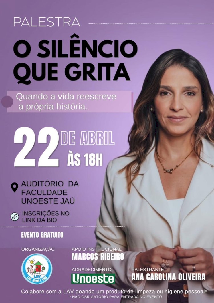 No próximo dia 22 de abril, no Auditório da Unoeste de Jaú, o Lar Amor e Vida (LAV) promove o evento “O silêncio que grita – da dor à proteção”, com palestra ministrada por Ana Carolina Oliveira, conhecida nacionalmente após a perda trágica da filha, Isabella Nardoni em 2008. Ana Carolina é vereadora de São Paulo e se dedica a causas sociais e à defesa das vítimas de violência, especialmente crianças e mulheres.