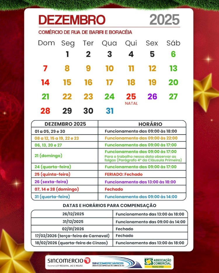 De acordo com a Associação Comercial e Industrial de Bariri (Acib), no período de 08 a 12 / de 15 a 19 e também nos dias 22 e 23 de dezembro, o comércio de Bariri funcionará das 9h às 22h. No domingo que antecede o Natal (21 de dezembro) e na véspera do feriado (24, quarta-feira), as lojas estarão abertas das 9h às 17h. No dia posterior ao Natal (26 de dezembro, sexta-feira), o funcionamento é das 13h às 18h. Já na véspera do ano novo (31 de dezembro, quarta-feira), último dia de 2025, o horário é das 9h às 14h.