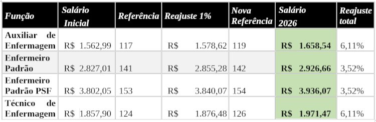 No caso da enfermagem, o reajuste e reenquadramento salarial das categorias em 2026 ficou em 3,52% (para enfermeiros) e 6,11% (para técnicos e auxiliares), conforme a tabela abaixo: