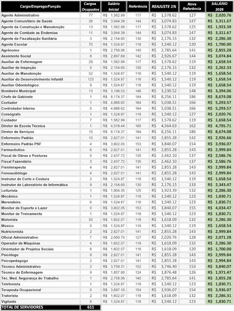 De maneira geral, a proposta em comum acordo entre Executivo e Sindicato dos Servidores Públicos Municipais, corrige em 1% (um por cento) as tabelas de vencimentos dos servidores municipais, autarquia Saemba e servidores do Legislativo, a partir de 1º de janeiro de 2026. Ou seja, todos os cargos do funcionalismo público tiveram salários reajustados em 1%. Já o vale-alimentação, passou de R$ 1.100,00 para R$ 1.200,00 neste ano.