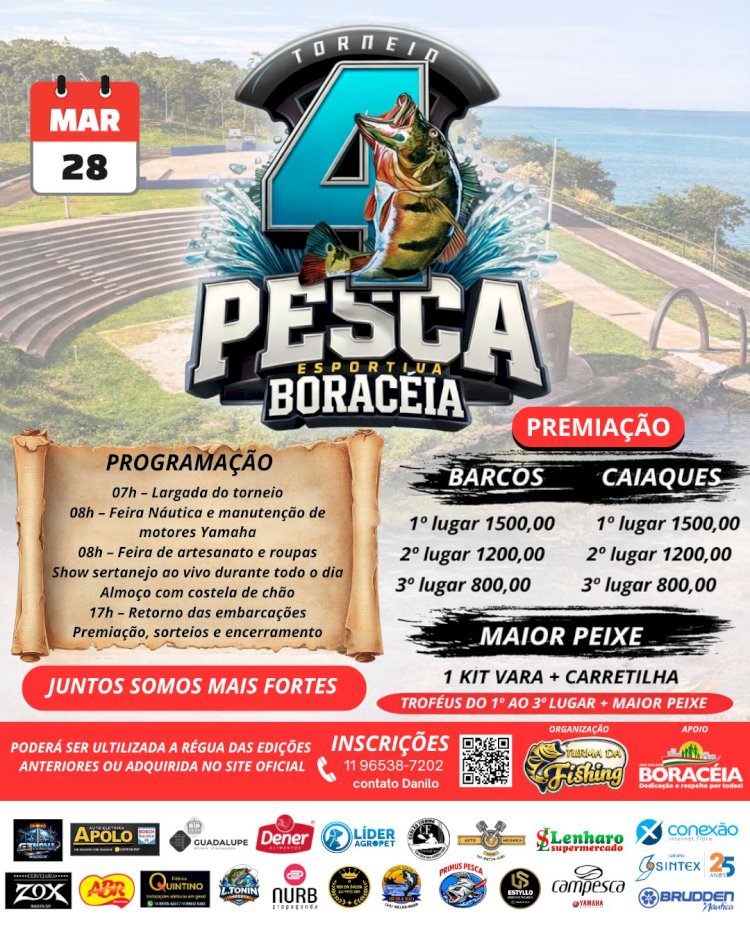 Atenção, pescadores! A Prefeitura Municipal de Boraceia, em parceria com a Turma do Fishing, anuncia o 4º Torneio de Pesca Esportiva na cidade. O evento marcado para 28 de março (sábado), das 7h às 17h, tem como objetivo promover a pesca esportiva e proporcionar diversão para toda a família. É o maior torneio de pesca do centro-oeste paulista!