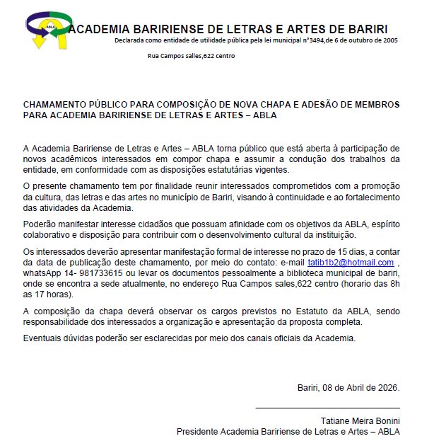 “A academia Baririense de Letras e Artes está com as atividades paralisadas por tempo indeterminado, tentando a sua reestruturação. Essa verba veio para que a academia utilizasse e achamos por bem repassar para outra entidade fazer uso. Não adianta a ABLA ficar com uma verba em caixa tendo as atividades paralisadas por conta da reestruturação. Agradecemos o dr. Paulo Crepaldi que destinou o recurso para a Academia e pedimos para ele repassar à outra entidade, que já esteja estruturada. Futuramente, quando a ABLA voltar suas atividades com membro atuantes, voltaremos a requerer ajuda por meio das emendas impositivas, para que voltemos a desenvolver atividades na área da cultura e das artes”, disse a presidente da ABLA por meio de nota.