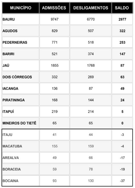 No topo da lista, o município de Bauru se destaca com 2977 empregos formais criados em julho. Bauru se consolida como a segunda cidade do estado de São Paulo que mais gerou empregos em julho, ficando apenas atrás de São Paulo Capital.