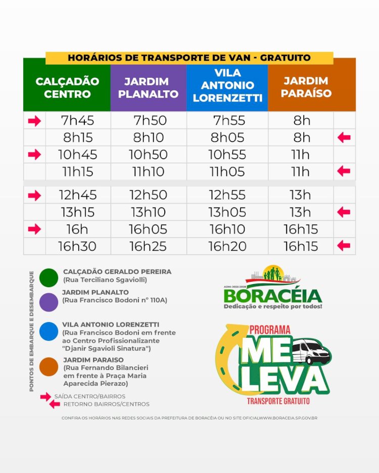 Começa a funcionar nesta quinta-feira (13), o programa de transporte coletivo gratuito de Boraceia. Inicialmente, um Van fará o transporte gratuito da população, no sentido centro/bairro e bairro/centro, em quatro horários distintos durante o dia.