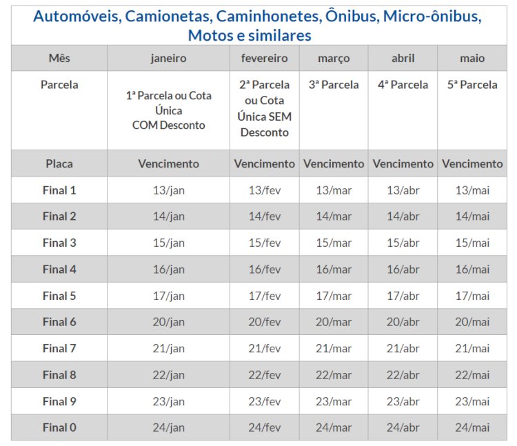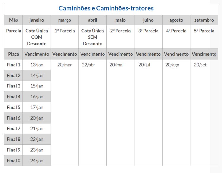 Os caminhões têm prazos diferenciados: para o pagamento integral antecipado em janeiro é concedido desconto de 3% − o calendário começa em 13 de janeiro e segue até o dia 24, conforme as tabelas abaixo. O vencimento em cota única, sem desconto, é 22 de abril.