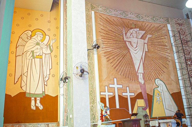 “Nossa igreja tem um rico painel no centro do seu presbitério que estava ladeado por duas paredes escuras – o que ao meu ver, tornava o ambiente um pouco pesado. Tive então a intenção de completar este painel, com um anjo de cada lado nas mesmas cores e características, para não agredir a riqueza do que já tínhamos e dar a impressão de um painel único para quem entra na igreja. Os anjos, um está olhando para o túmulo aberto de onde sai o ressuscitado e, o outro, com os olhos elevados para o Cristo ressuscitado, vencedor da morte”, explica Pe. Lázaro.