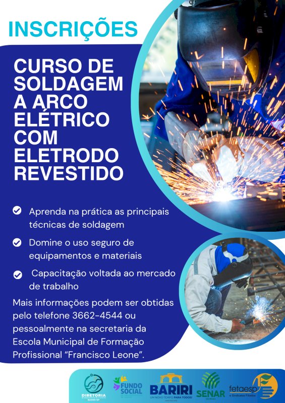 As inscrições para o curso de Soldagem a Arco Elétrico com Eletrodo Revestido já estão abertas e podem ser realizadas de segunda a quinta-feira, das 8h às 11h30 e das 13h às 20h e de sexta-feira das 8h às 11h30 e das 13h às 17h presencialmente na secretaria da Escola Municipal de Formação Profissional “Francisco Leone”, situada à Av. XV de Novembro, nº196, Centro.